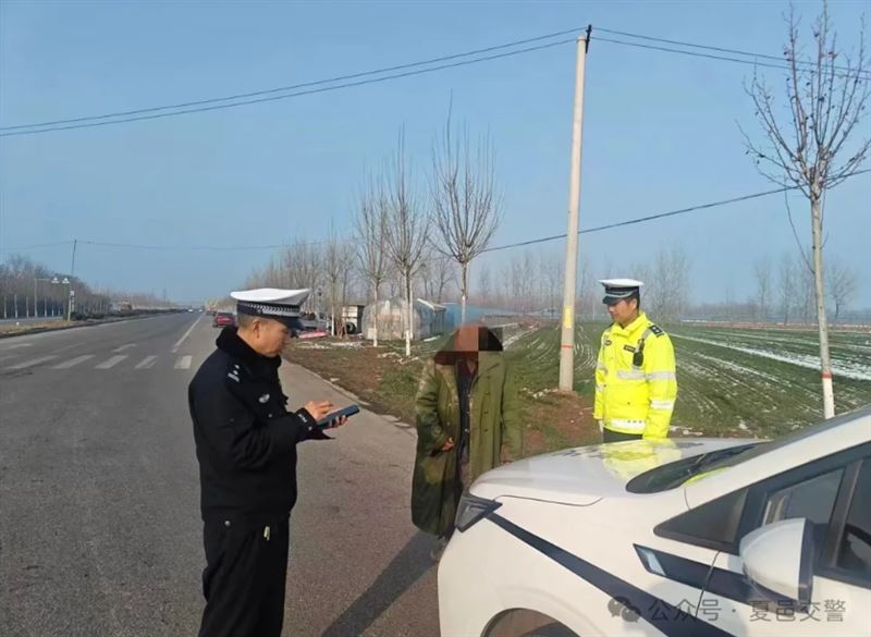 2026年1月24日15时02分许,夏邑县公安局交通管理大队胡桥中队指导员李华带领辅警王东晓、张营放、贾宇璞、单威威四人驾车沿国道G343线巡逻至胡桥乡郭程楼村路段时,发现路边一名穿着军大衣的老人脸上