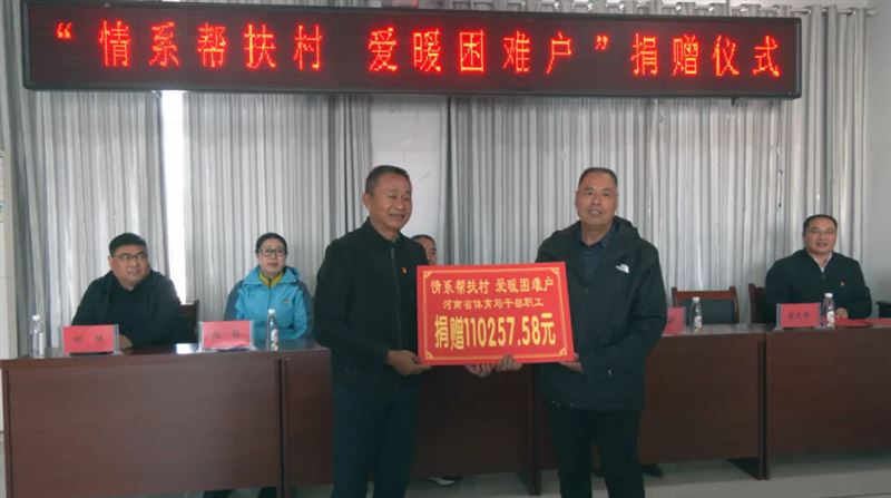 雷志章表示,本次慰问捐赠河南省体育发展基金会将捐助善款11万元,与省体育局系统职工群众爱心捐助的11万元配套作为“情系帮扶村 爱暖困难户”活动的专项资金,按照省体育局工会和孟李庄村驻村工作队的帮扶方案,逐年落实到帮扶工作活动中。