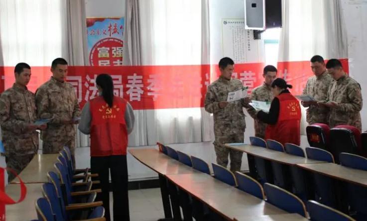 司法局普法志愿者向150余名新兵发放《中华人民共和国兵役法》《中华人民共和国法律援助法》等法律宣传手册,让新兵在训练之余通过学习来丰富法律知识和提高法律涵养,增强广大官兵学法、知法、守法、用法能力,学会用法律维护自身合法权益。