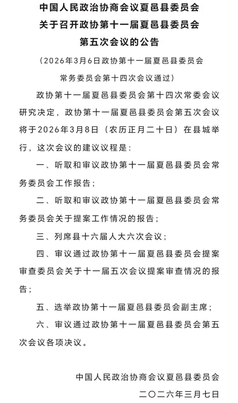 中国人民政治协商会议夏邑县委员会关于召开政协第十一届夏邑县委员会第五次会议的公告