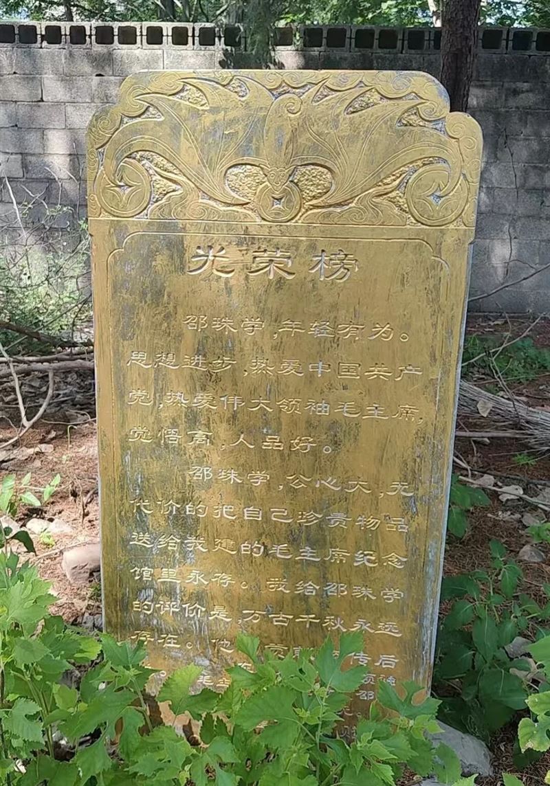 在火店镇田集村有一处纪念地,一方镌刻着“光荣榜”的功德碑,为邵珠学的精神品格写下生动注脚:“邵珠学,年轻有为。思想进步,热爱中国共产党,热爱伟大领袖毛主席,觉悟高,人品好……”字里行间,是他对理想的追求、对信仰的赤诚、对公益的坚守,更留下“万古千秋永远存在”的口碑赞誉。