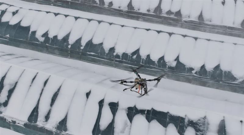 在彭楼村草莓大棚现场,随着指挥员一声清脆的“起飞”指令,无人机即刻腾空而起,红绿灯光在白雪映衬下格外醒目,螺旋桨高速转动发出沉稳的“嗡嗡”声,沿着大棚顶部有序巡航,均匀喷洒融雪剂。短短10分钟,首轮融雪作业便顺利完成,无人机稳稳回落地面。早已等候在旁的工作人员迅速上前,熟练地为无人机灌装工业盐融雪剂,动作麻利连贯,全力保障第二轮作业无缝衔接,让融雪除冰效率最大化。