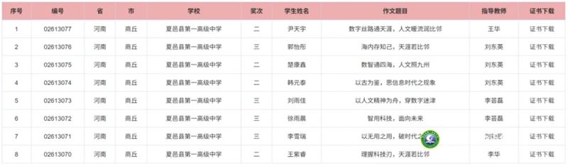 热烈祝贺夏邑县第一高级中学尹天宇、郭怡彤、楚康鑫、韩元泰、刘雨佳、徐雨晨、李雪瑞、王紫睿八名学生分别荣获第二十六届世界华人学生作文大赛奖项。